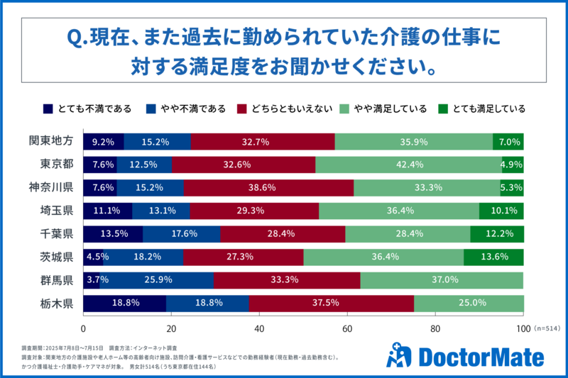 不満を持つ介護職は栃木県(18.8%)や千葉県(13.5%)で比較的多いものの、茨城県(13.6%)や千葉県(12.2%)では「とても満足している」とする声も一定数あり、満足度の二極化が示唆されました。