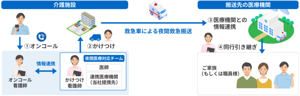 本サービスは、弊社の現行サービス「夜間オンコール代行™」(※1) に加え、夜間に看護師が介護施設にかけつけ、医療対応や、夜間の救急搬送発生時の医療機関への同行を代行するものです。
