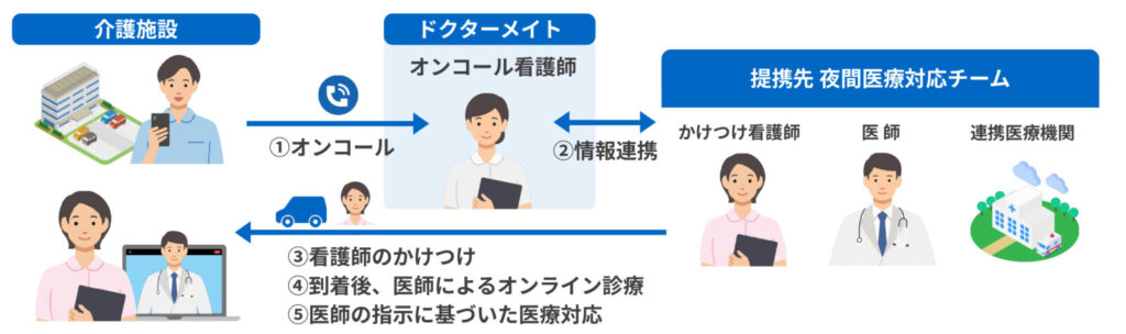 施設からドクターメイト看護師にオンコール受信後、医療処置が必要な場合にドクターメイトが提携する医療機関の「かけつけ看護師」が施設にかけつけたうえで、医師のオンライン診療とともに医師の指示に基づいた傷の処置、バルーン再挿入、喀痰吸引など医療対応を行います。これにより、夜間の医療体制課題の低減を目指します。