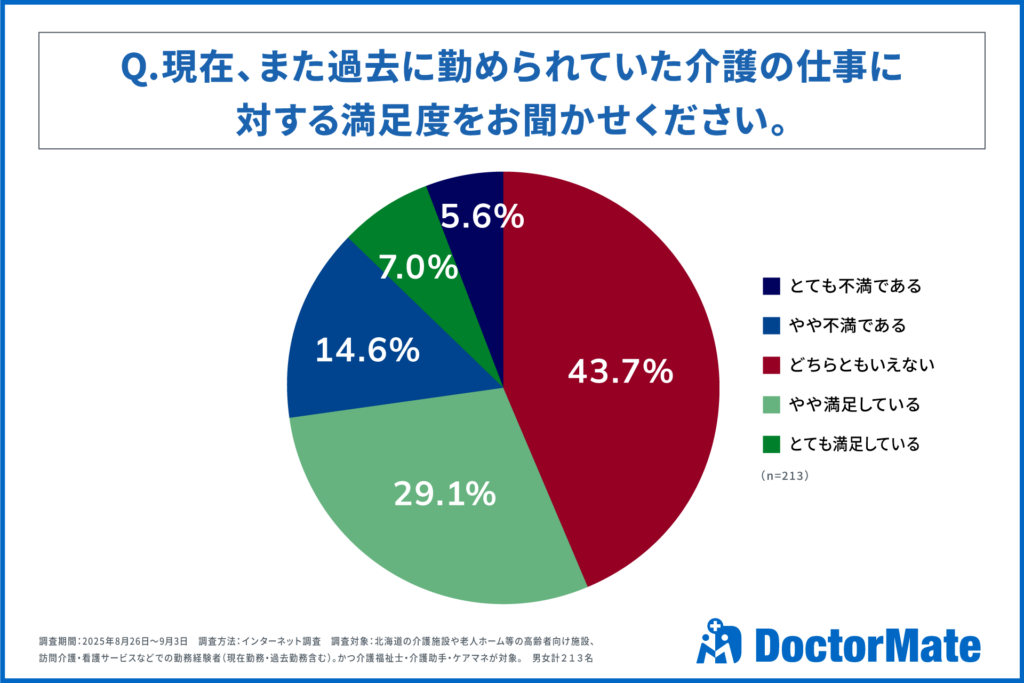 介護事業所向けに医療ソリューションを提供するドクターメイト株式会社(本社:東京都中央区、代表取締役・医師:青柳 直樹、以下ドクターメイト)は、この度、北海道に勤務する介護職員213名を対象に、介護の仕事に関する意識調査を実施いたしました。調査の結果、介護職員は「感謝」に高いやりがいを感じている一方、業界全体の課題に加え、北海道特有の課題「交通の便」にも直面していることが判明しました。